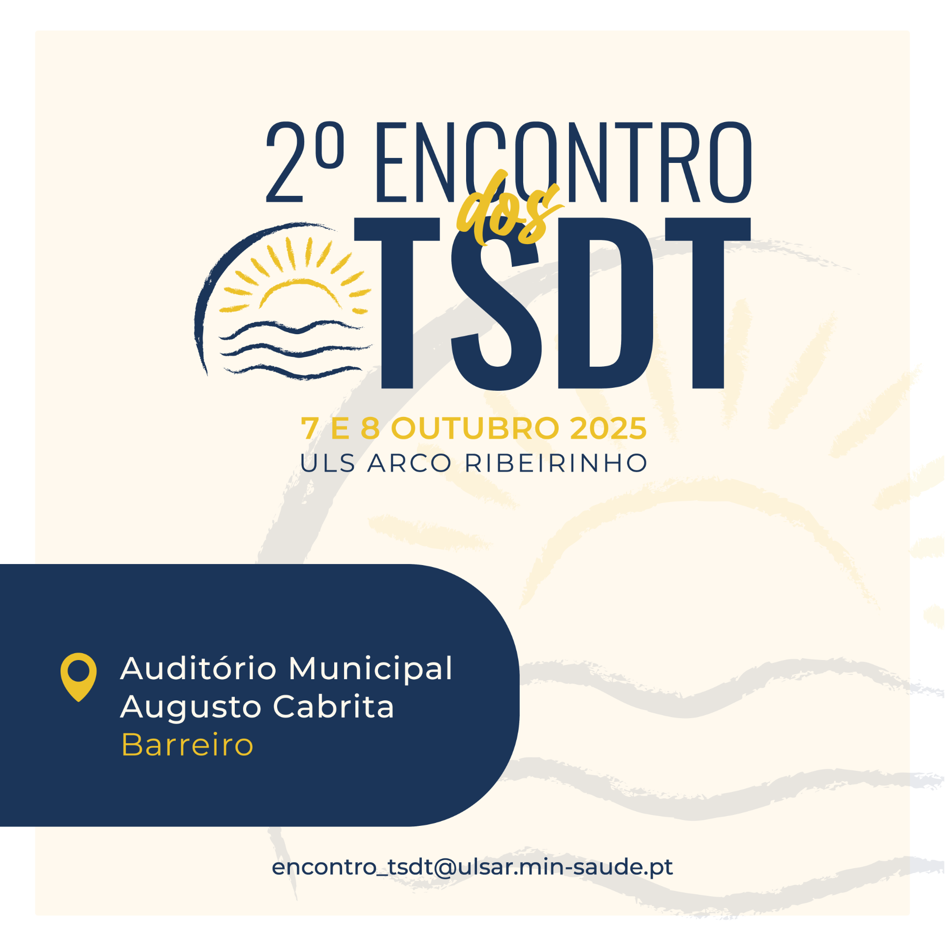 Estamos a preparar o 2º Encontro dos Técnicos Superiores de Diagnóstico e Terapêutica (TSDT) da Unidade Local de Saúde do Arco Ribeirinho (ULSAR), nos dias 7 e 8 de outubro 2025, no Auditório Municipal Augusto Cabrita, Barreiro.